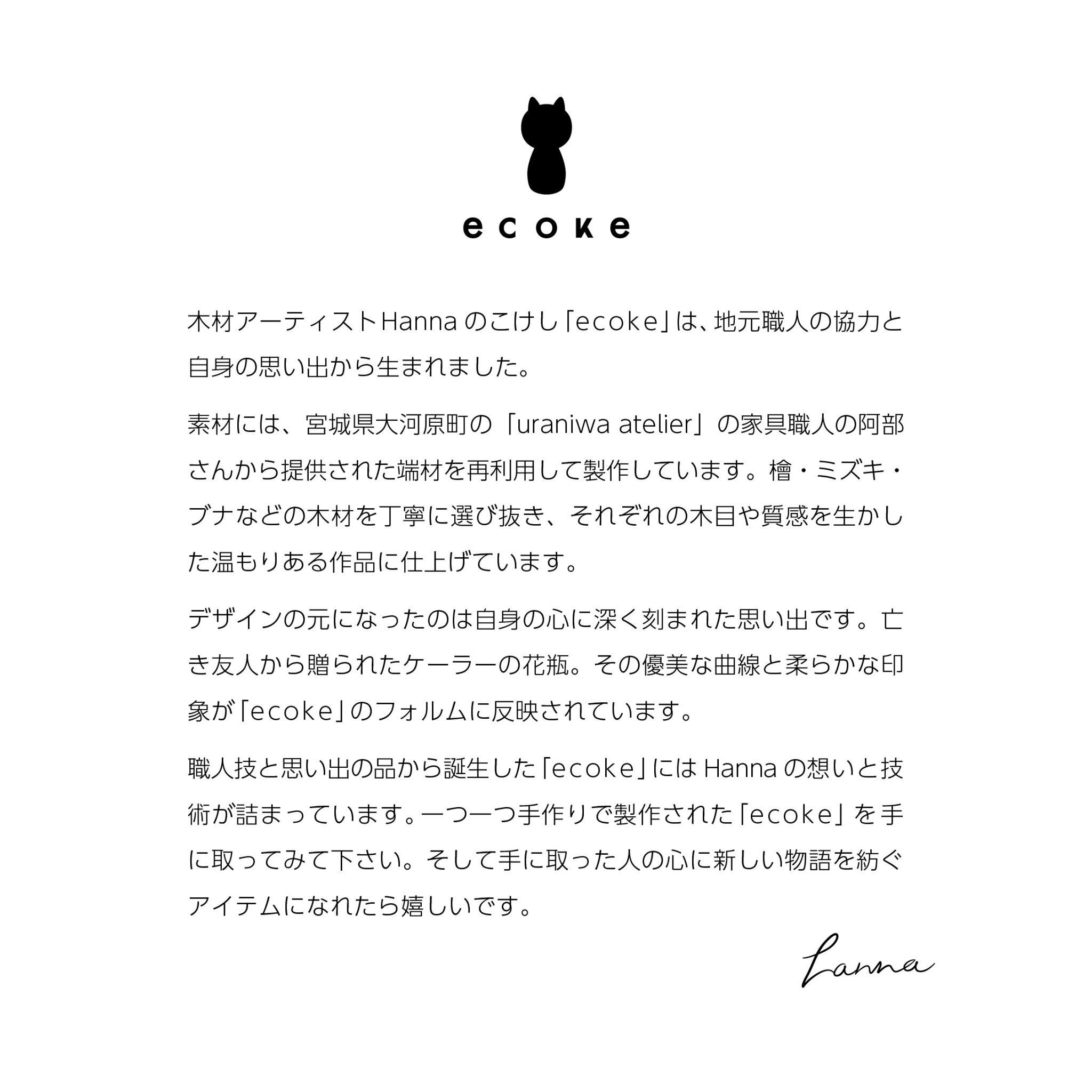 木材アーティスト Hanna のこけし「ecoke(エコケ)」は、地元の家具職人さんに協力いただき、端材を再利用して生まれたサステナブルなアート作品です。